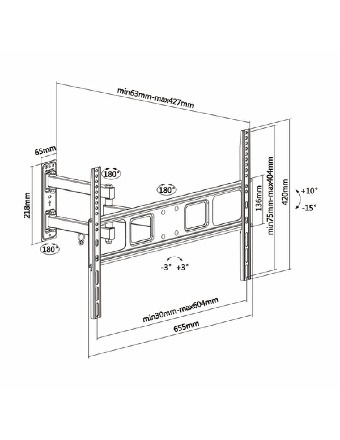 AISENS WT70TSLE-021. Capacidad máxima de peso: 35 kg, Tamaño mínimo de pantalla: 94 cm (37"), Tamaño máximo de pantalla: 177,8 cm (70"), Compatibilidad con interfaz de montaje (min): 200 x 200 mm, Compatibilidad con interfaz de montaje (max): 600 x 400 mm. Ángulo de inclinación: -15 - 10°, Ángulo de rotación: 90°, Distancia a la pared (min): 6,3 cm, Distancia a la pared (max): 42,7 cm. Color del producto: Negro