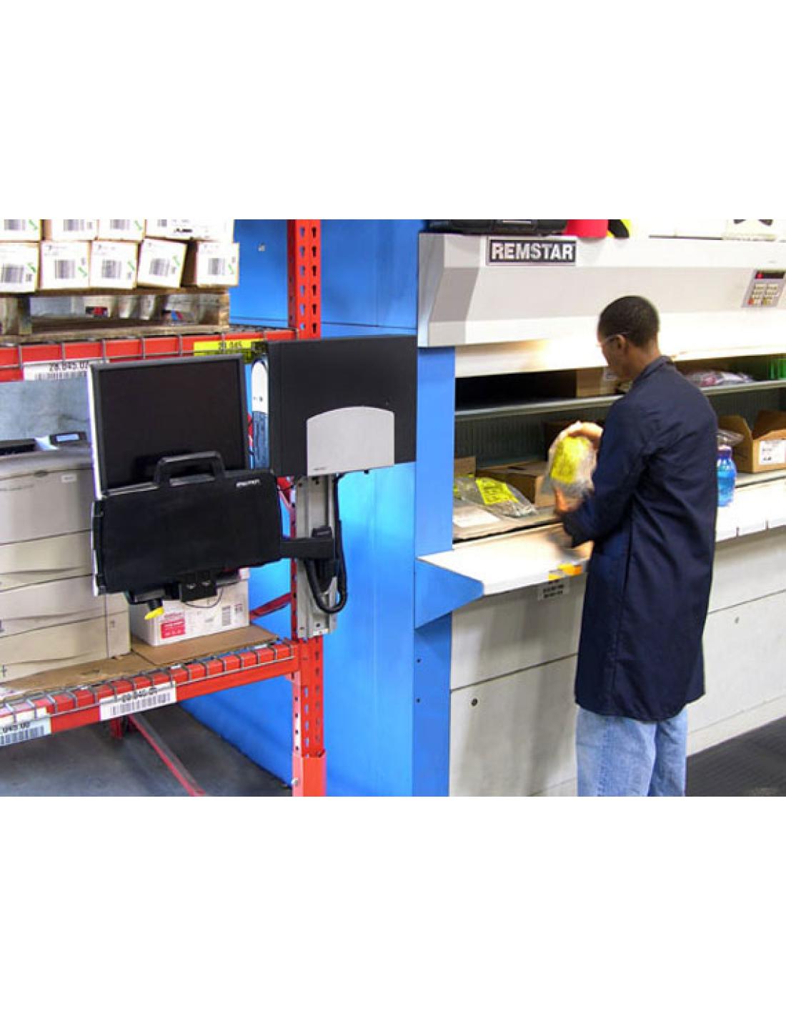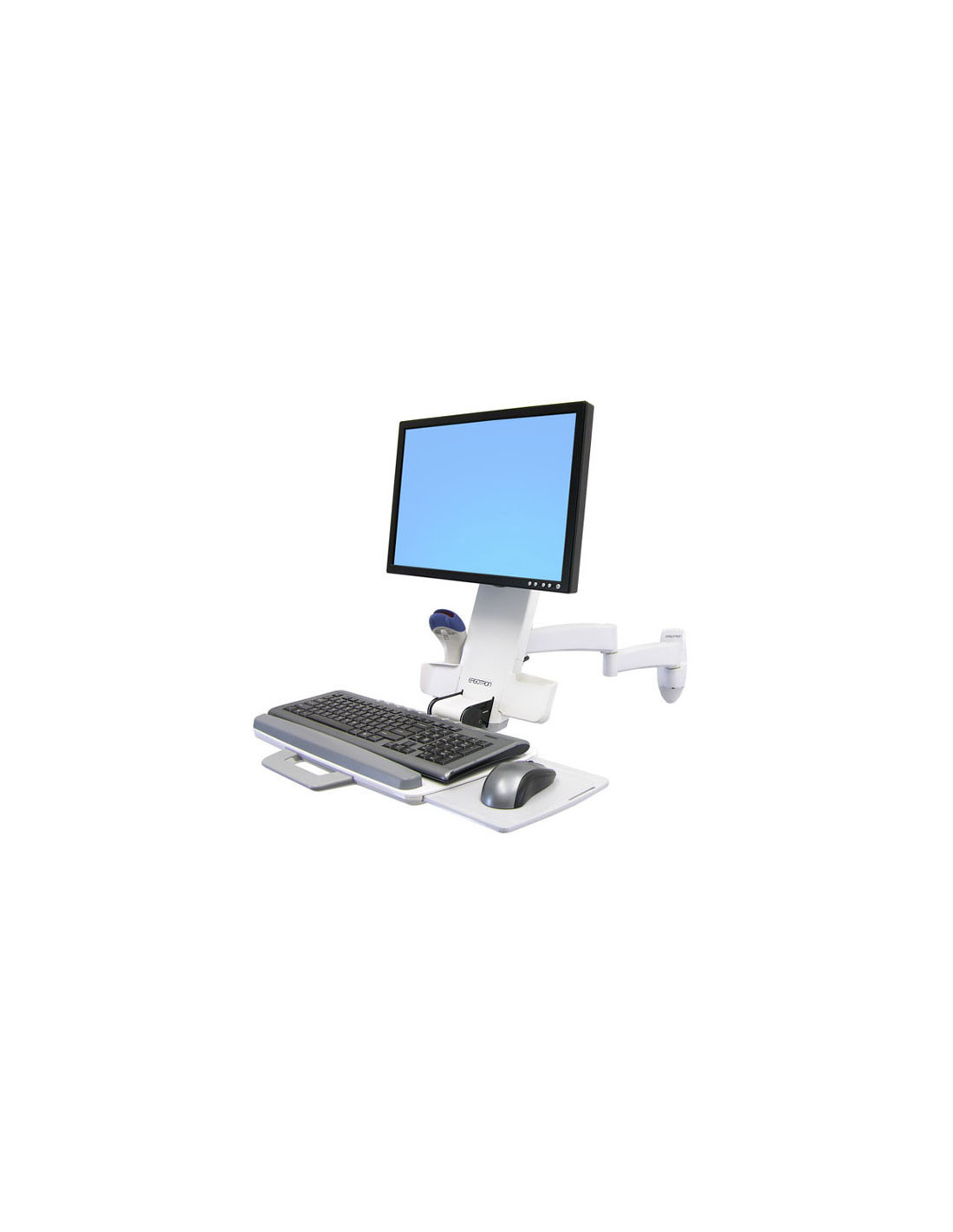 El Combo 200 tiene espacio para un monitor, lector óptico de códigos de barras, teclado, reposamuñecas y ratón en el mismo brazo. El brazo se extiende y se retrae, y se pliega por completo para quitarlo de enmedio mientras no está en uso. Un sistema exclusivo permite ocultar y organizar los cables para facilitar la limpieza.