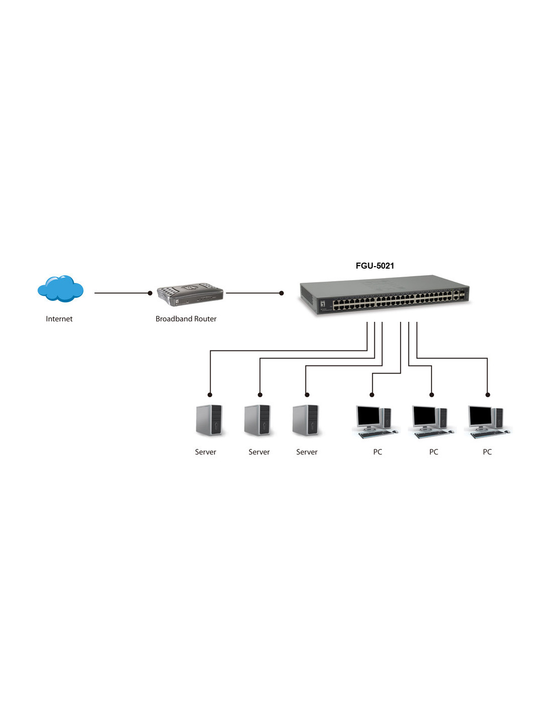 LevelOne FGU-5021. Puertos tipo básico de conmutación RJ-45 Ethernet: Fast Ethernet (10/100), Cantidad de puertos básicos de conmutación RJ-45 Ethernet: 50, Puerto de consola: RJ-45. Bidireccional completo (Full duplex). Tabla de direcciones MAC: 8000 entradas, Capacidad de conmutación: 13,6 Gbit/s. Estándares de red: IEEE 802.3, IEEE 802.3az, IEEE 802.3u. Montaje en rack