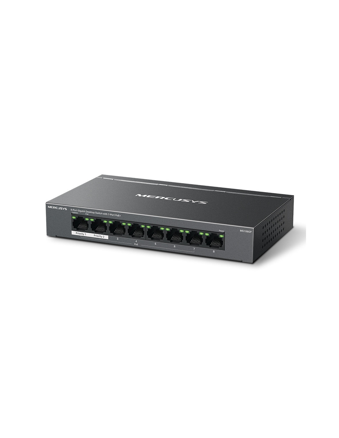 Mercusys MS108GP. Tipo de interruptor: Gestionado. Puertos tipo básico de conmutación RJ-45 Ethernet: Gigabit Ethernet (10/100/1000), Cantidad de puertos básicos de conmutación RJ-45 Ethernet: 8. Bidireccional completo (Full duplex). Tabla de direcciones MAC: 8000 entradas. Estándares de red: IEEE 802.3af, IEEE 802.3at, IEEE 802.3x. Energía sobre Ethernet (PoE). Montaje de pared