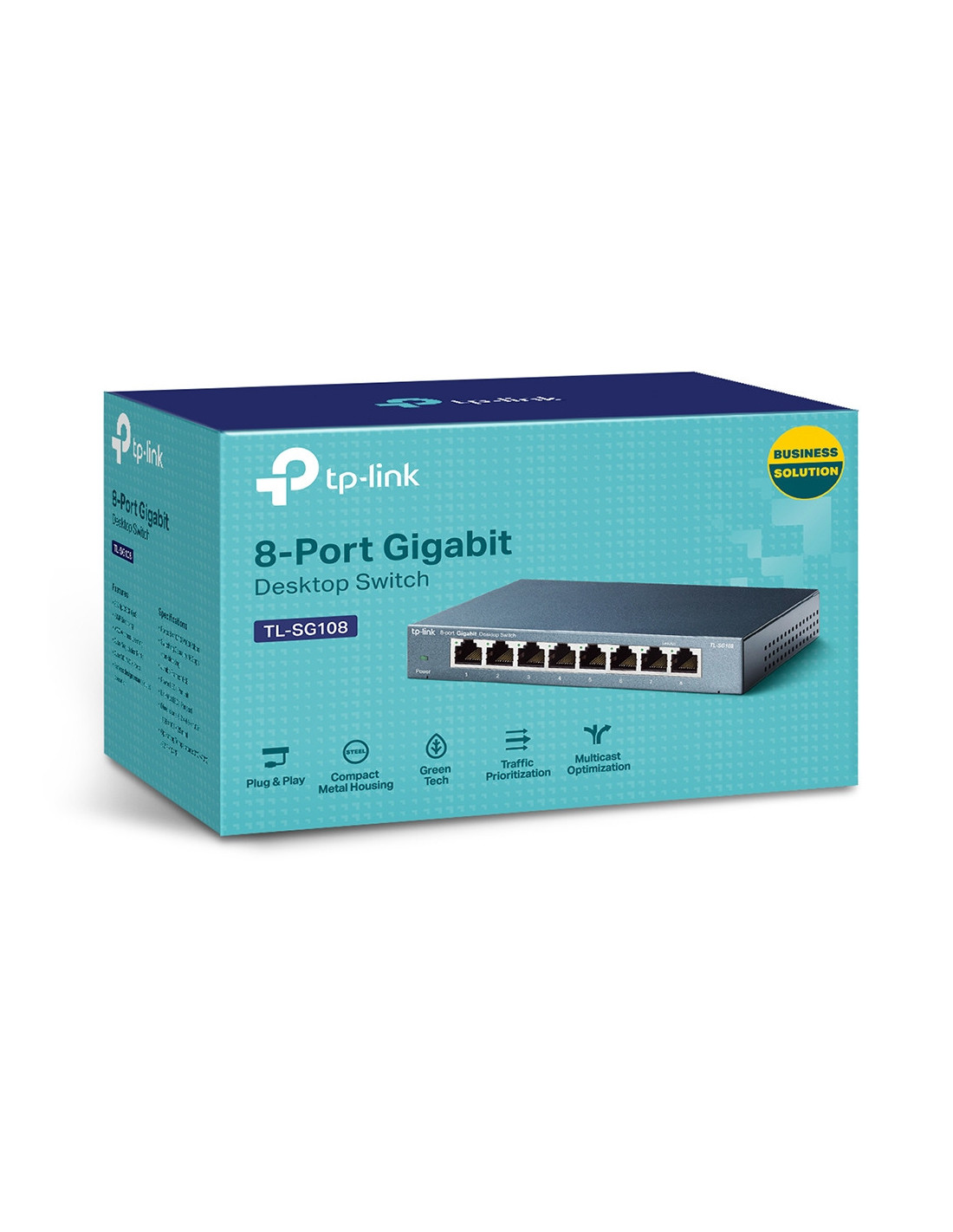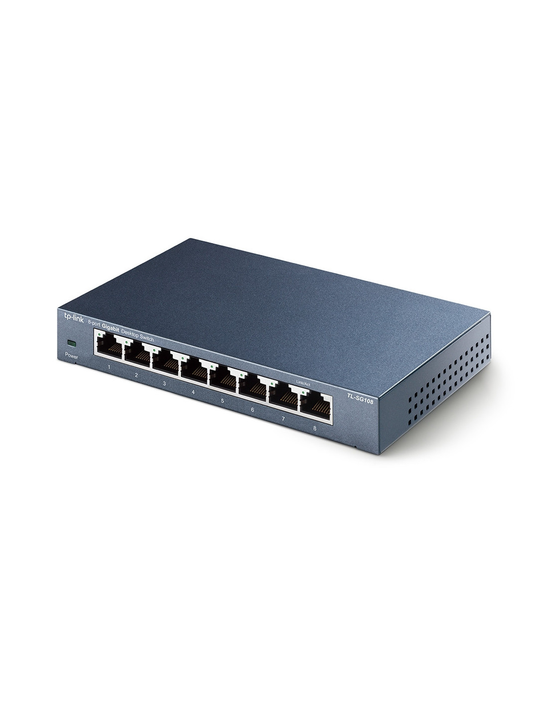 TP-Link TL-SG108. Tipo de interruptor: No administrado. Puertos tipo básico de conmutación RJ-45 Ethernet: Gigabit Ethernet (10/100/1000), Cantidad de puertos básicos de conmutación RJ-45 Ethernet: 8. Bidireccional completo (Full duplex). Tabla de direcciones MAC: 4000 entradas, Capacidad de conmutación: 16 Gbit/s. Estándares de red: IEEE 802.1p, IEEE 802.3ab, IEEE 802.3i, IEEE 802.3u, IEEE 802.3x. Conector eléctrico: Toma de entrada de CC