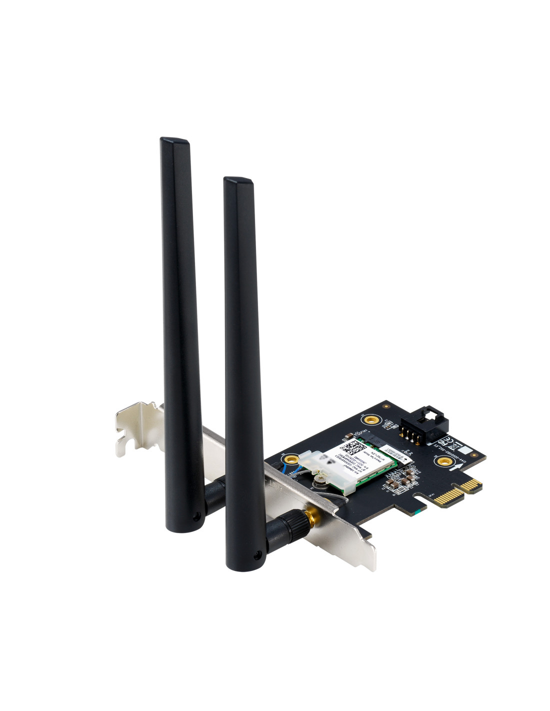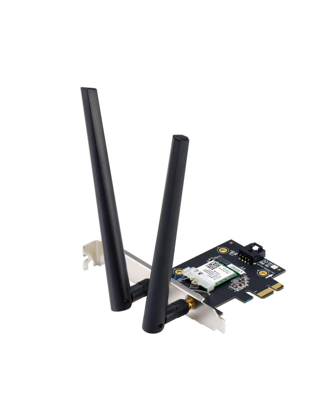 ASUS PCE-BE6500. Interno. Tecnología de conectividad: Inalámbrico, Interfaz de host: PCI Express, Interfaz: WLAN / Bluetooth. Rango máximo de transferencia de datos: 2882 Mbit/s, Estándar Wi-Fi: Wi-Fi 7 (802.11be), Banda Wi-Fi: Tribanda (2.4 GHz / 5 GHz / 6 GHz). Color del producto: Negro, Acero inoxidable