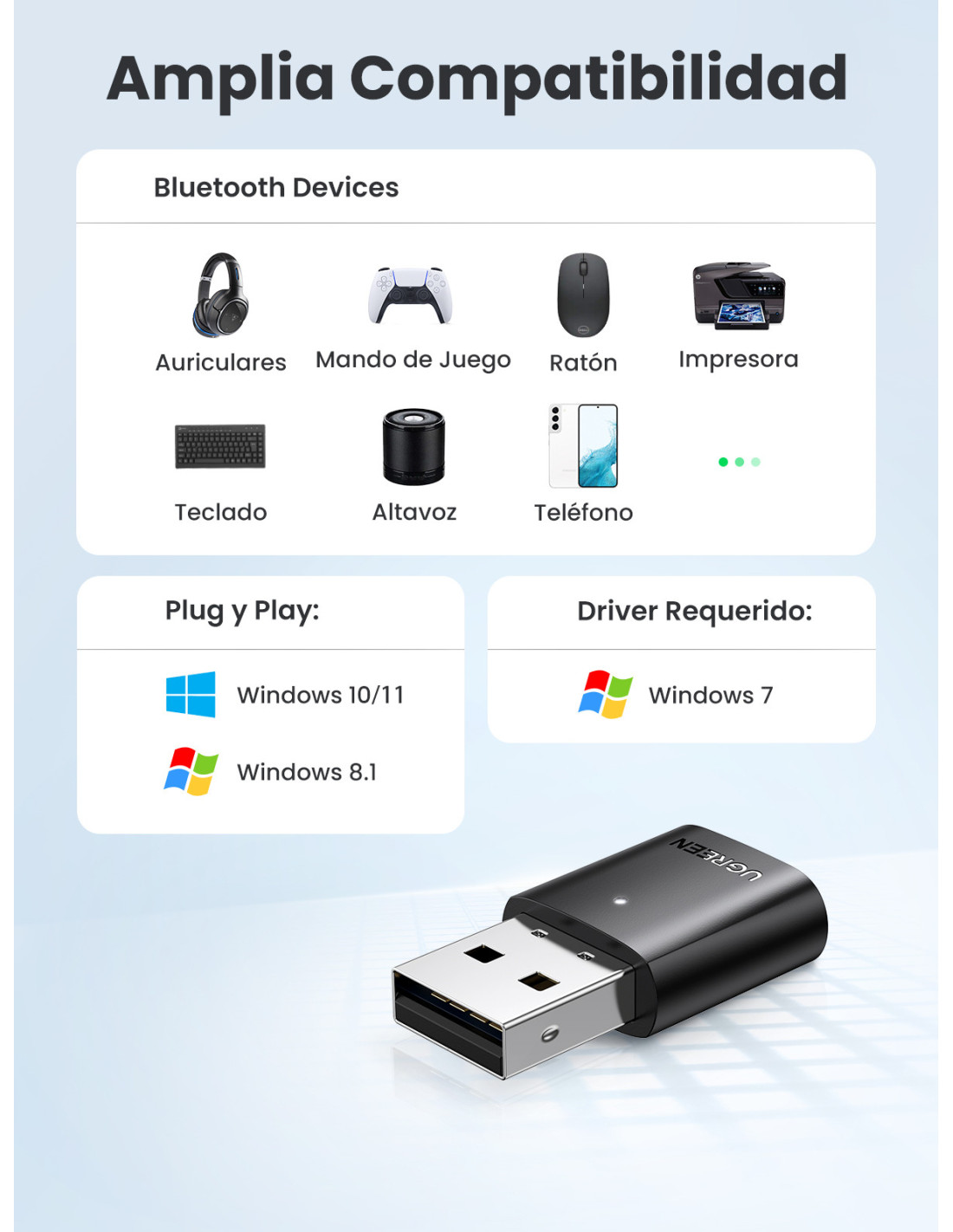 .Amplia compatibilidad: el adaptador USB Bluetooth de UGREEN es compatible con Windows 11, 10, 8.1 y 7, y ofrece la función Bluetooth para auriculares, altavoces, teclados, ratones, mandos, impresoras, teléfonos móviles y mucho más.