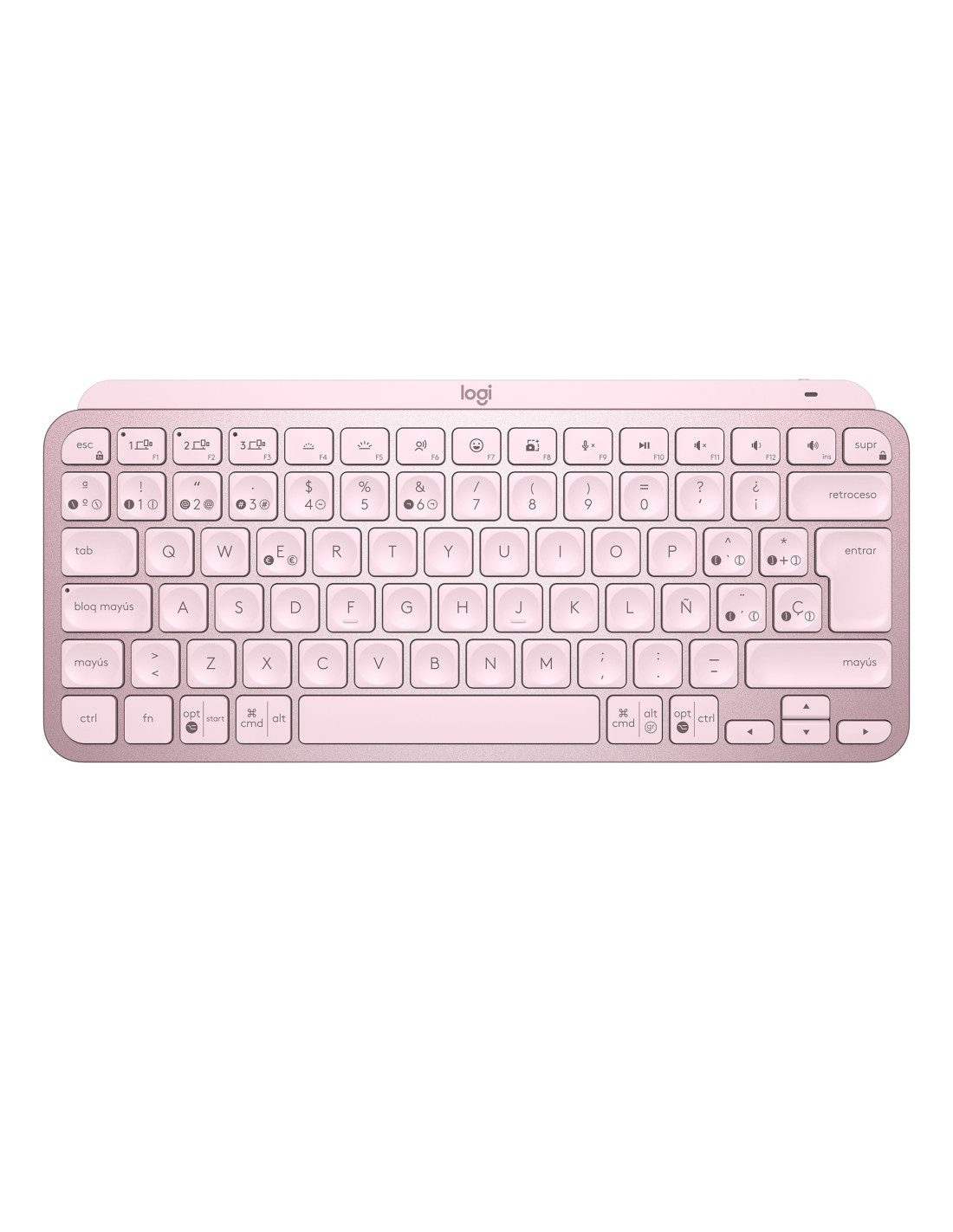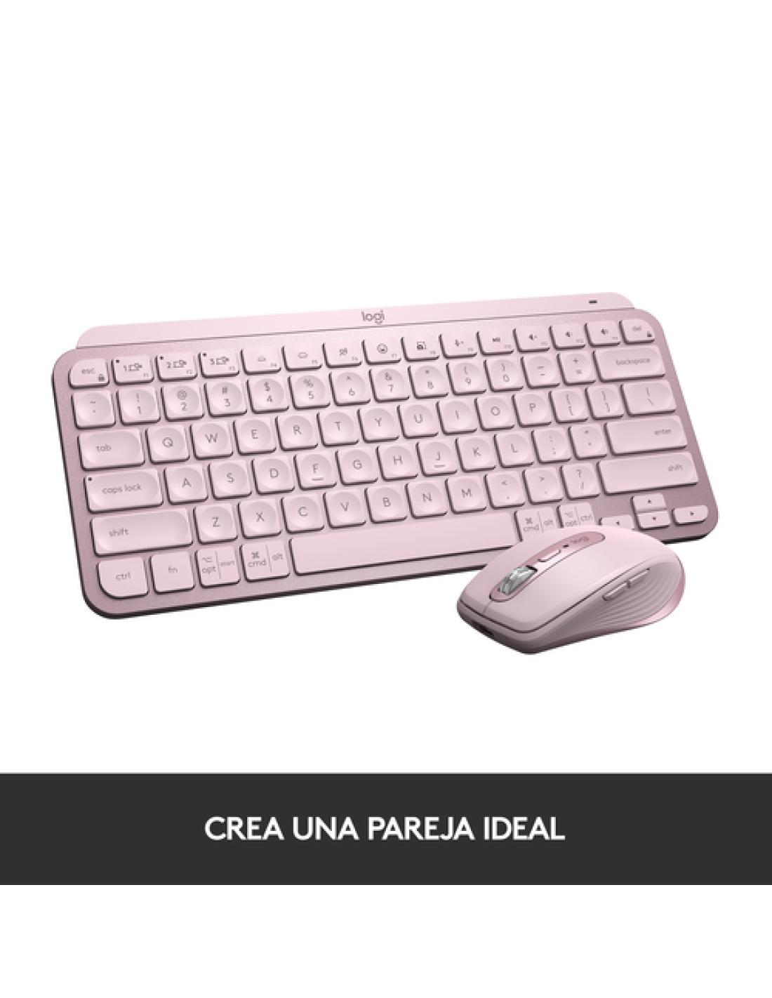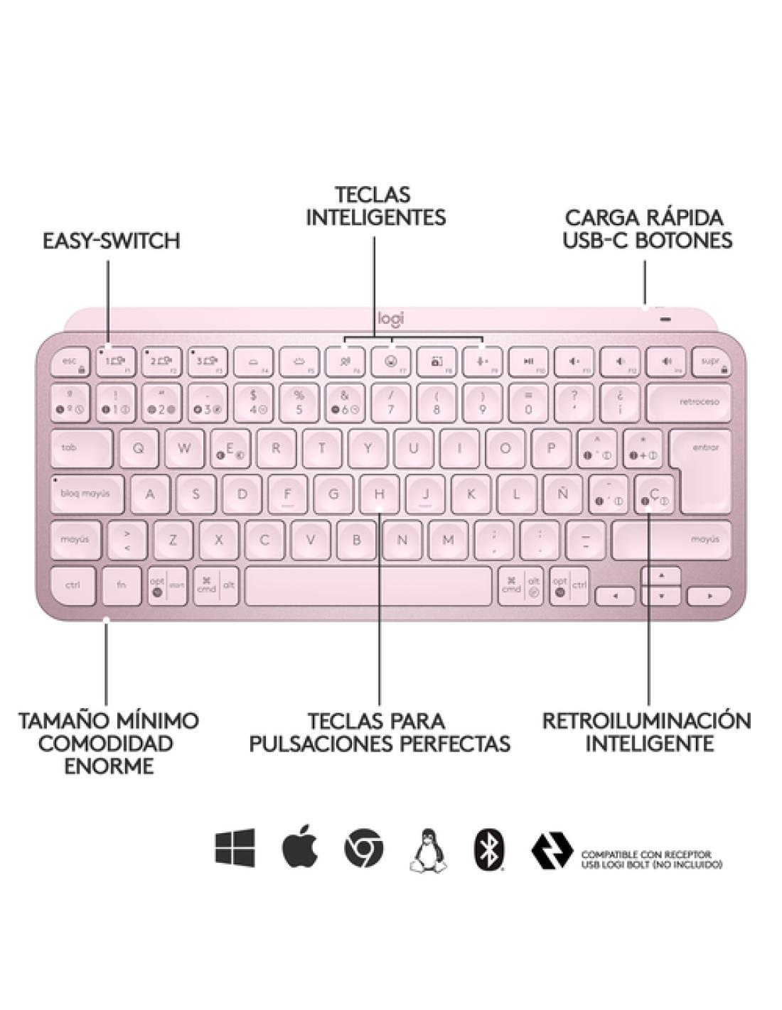 Logitech MX Keys Mini. Formato del teclado: Mini. Estilo de teclado: Derecho. Tecnología de conectividad: Inalámbrico, Interfaz del dispositivo: RF Wireless + Bluetooth, Diseño de teclado: QWERTY. Tipo de retroiluminación: LED. Uso recomendado: Oficina. Color del producto: Rosa
