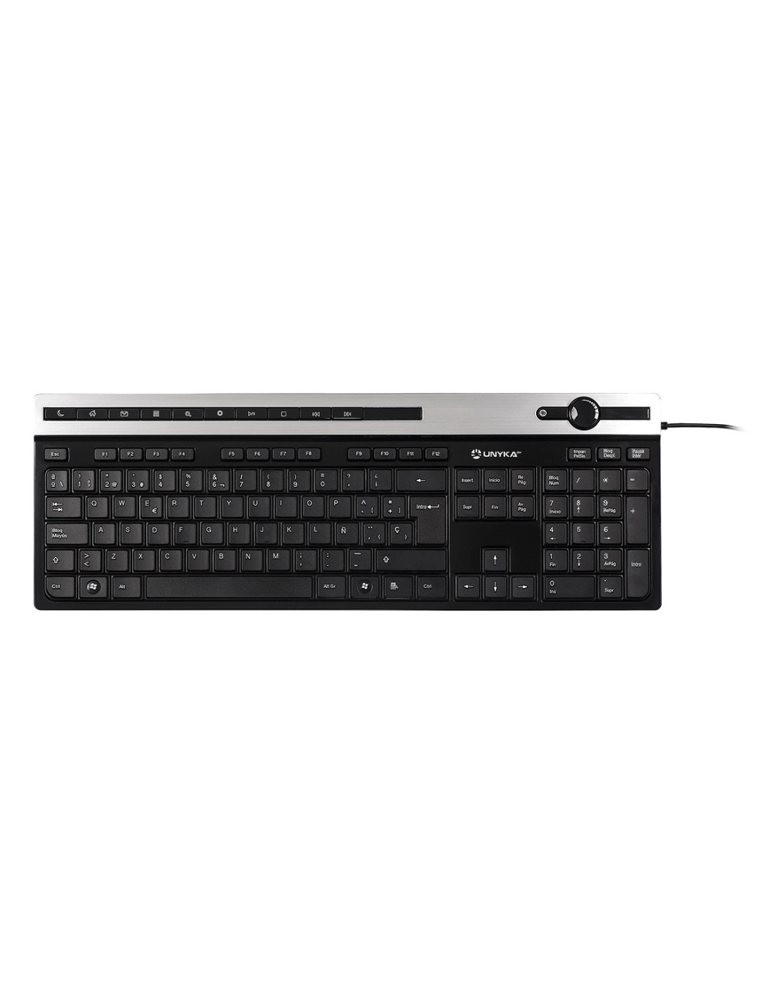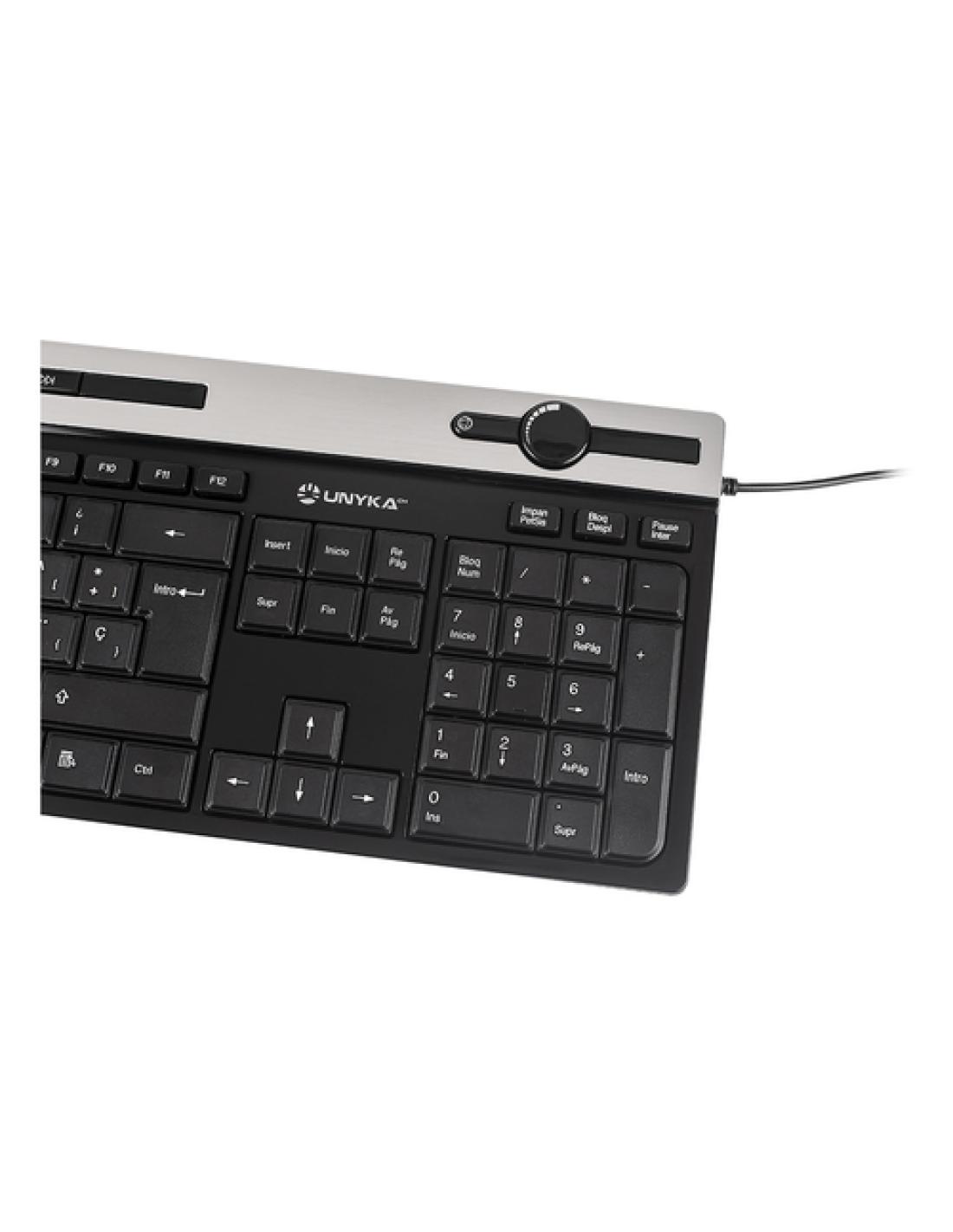 UNYKAch A 2930. Formato del teclado: Completo (100%). Estilo de teclado: Derecho. Tecnología de conectividad: Alámbrico, Interfaz del dispositivo: USB, Interruptor del teclado: Interruptor de membrana, Diseño de teclado: QWERTY, Teclado, cantidad de teclas: 117. Longitud de cable: 1,3 m. Uso recomendado: Hogar. Color del producto: Negro, Plata