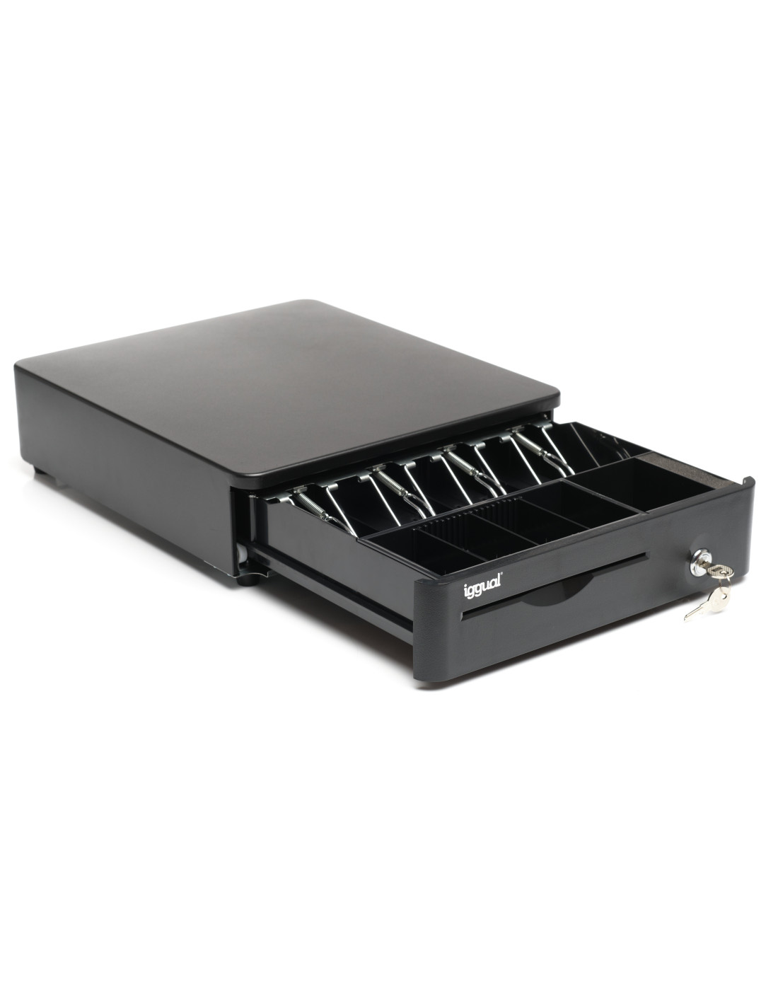 El IRON-10R está diseñado para optimizar el espacio sin renunciar a la capacidad: ofrece compartimentos organizados para billetes y monedas, todo ello protegido mediante una cerradura de 3 posiciones que permite apertura manual, automática mediante conexión RJ11 (cable incluido), o bloqueo total en posición abierta o cerrada.