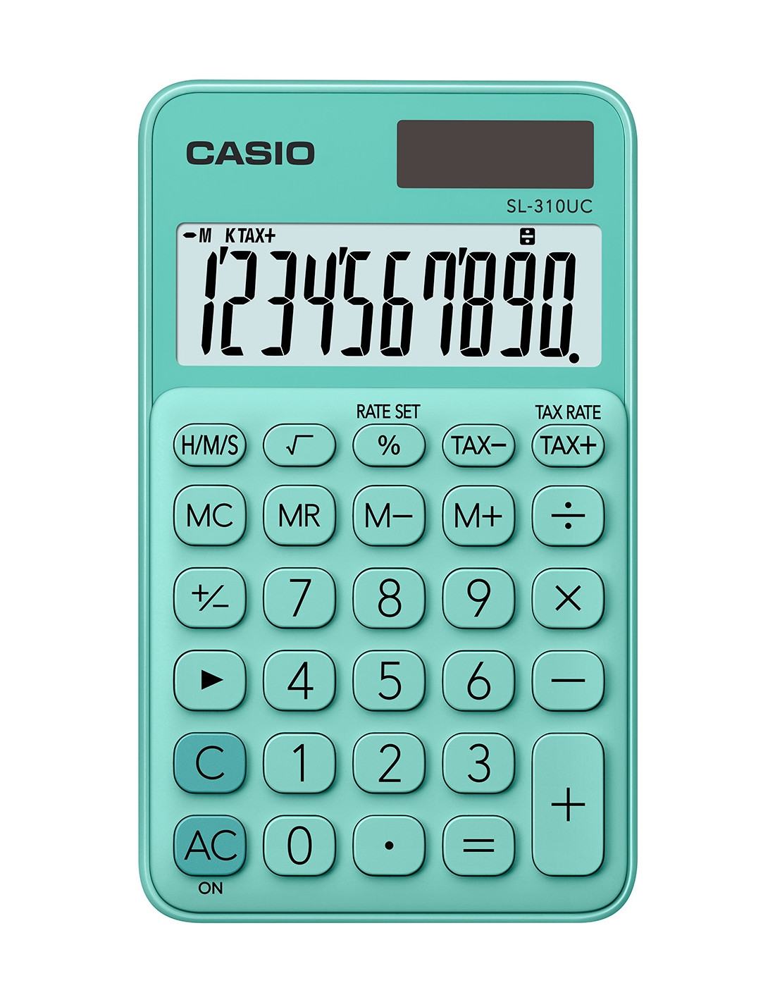 Casio SL-310UC-GN. Factor de forma: Bolsillo, Tipo: Calculadora básica. Dígitos: 10 dígitos, Número de líneas en pantalla: 1 líneas. Cálculo de impuestos, Cálculo de ganancias. Fuente de energía: Batería/Solar. Color del producto: Verde