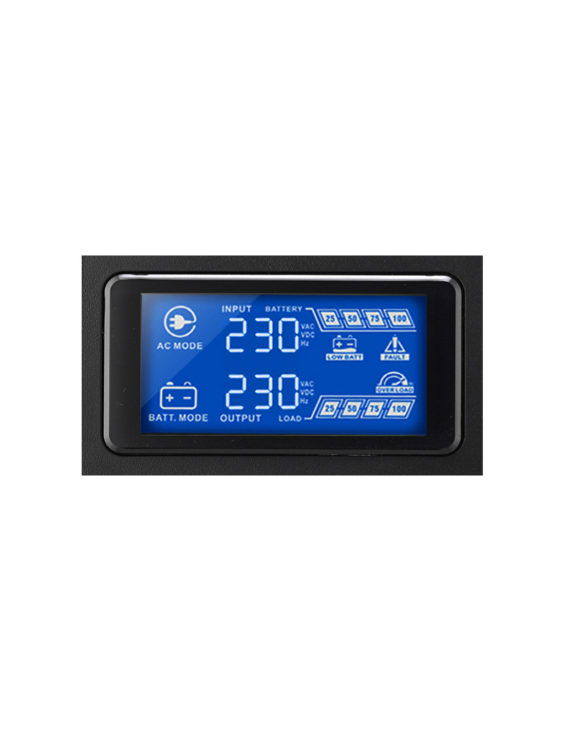 La pantalla LCD frontal también permite la supervisión inmediata de todos los parámetros clave, como las alarmas, el estado de funcionamiento de la red/batería, la carga del SAI y el nivel de carga de la batería.