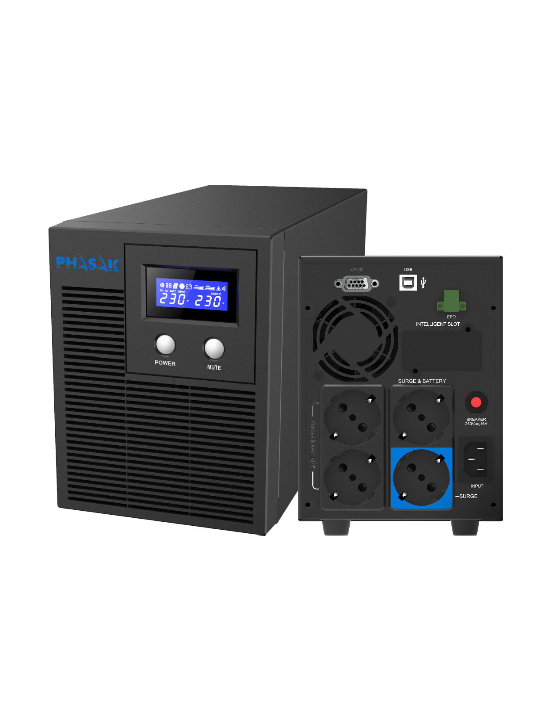 El SAI Phasak Protekt Torre Interactivo de 1060 VA, modelo PH 7610, perteneciente a la serie Protekt en formato Torre, ofrece una solución completa y altamente eficiente para los equipos conectados. Con un diseño robusto y compacto que incorpora todas las tomas necesarias para satisfacer las demandas del usuario más exigente, este SAI cuenta con un completo display que proporciona información en tiempo real. La toma Surge Protect incorporada en todas las referencias permite la conexión de equipos con altos picos de tensión, ofreciendo una capa adicional de protección.