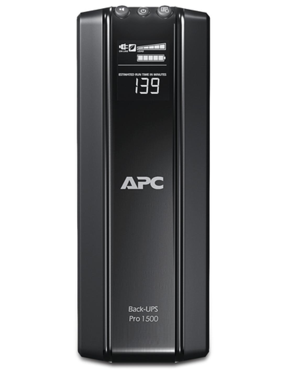 APC Back-UPS Pro. Topología UPS: Línea interactiva, Capacidad de potencia de salida (VA): 1,5 kVA, Potencia de salida: 865 W. Tipo de salida AC: C13 acoplador, Conector: C14 acoplador, Cantidad de salidas AC: 10 salidas AC. Tecnología de batería: Sealed Lead Acid (VRLA), Capacidad de la batería: 187 VAh, Tiempo típico de respaldo a carga completa: 3,7 min. Color del producto: Negro, Tipo de visualizador: LCD. Certificados de conformidad: RoHS, Certificación: A-tick, C-tick, CE, GOST, GS Mark, Telepermit, TUV, REACH, PEP, EOLI, NEMKO-GS