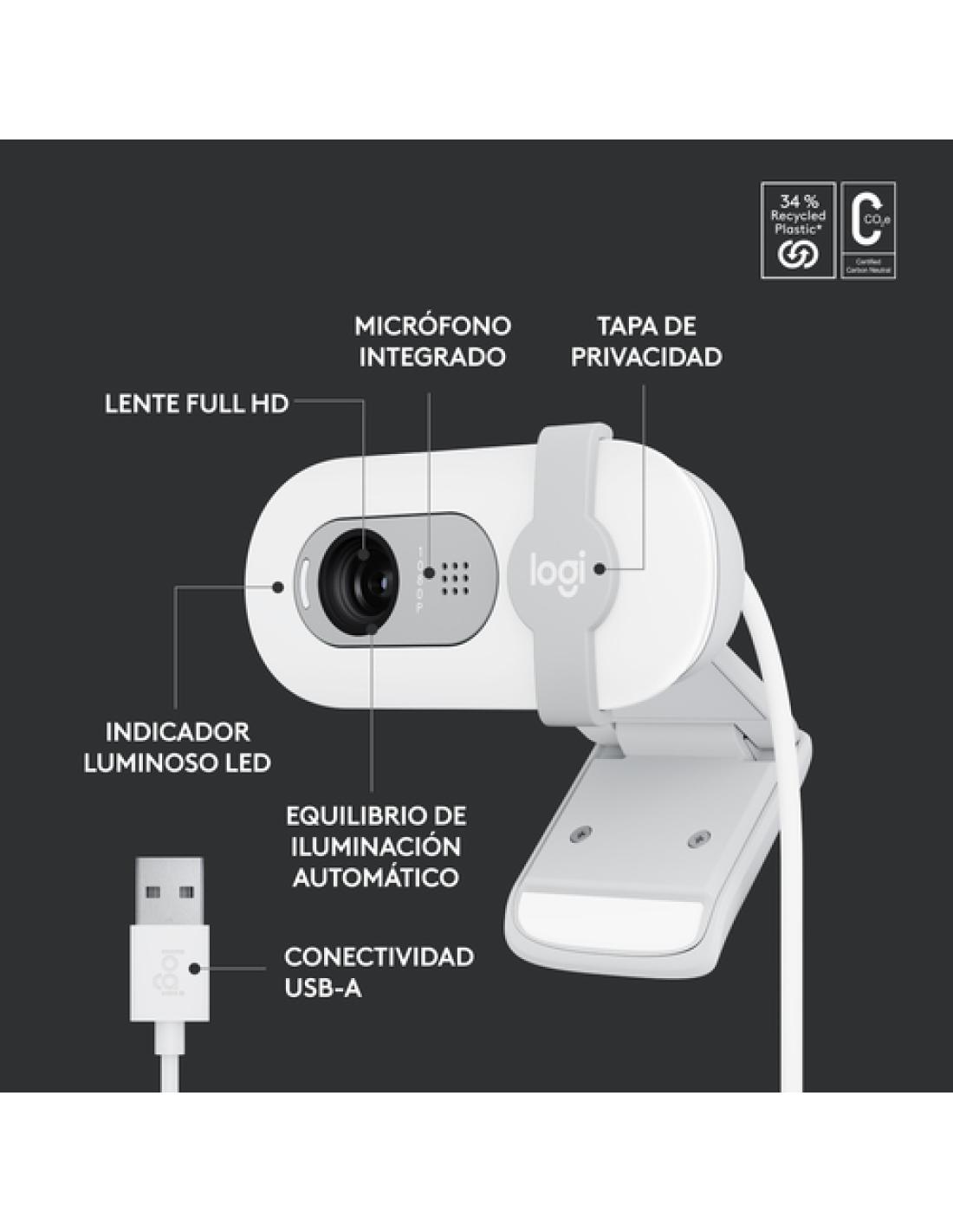 Logitech Brio 100. Megapixeles: 2 MP, Máxima resolución de video: 1920 x 1080 Pixeles, Tipo de cámara HD: Full HD. Interfaz: USB, Color del producto: Blanco, Tipo de montaje: Clip/Soporte. Sistema operativo MAC soportado: MacOS, Otros sistemas operativos soportados: ChromeOS. Certificados de sostenibilidad: CarbonNeutral, Forest Stewardship Council (FSC). Ancho: 72,9 mm, Profundidad: 66,6 mm, Altura: 31,9 mm